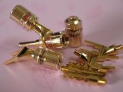 24K gold plated loudspeaker connector for cables up to 6mm2. The banana pin fits also BFA plugs or connectors. The cable can be attached straight on axis or at a 90 degree angle. A spade can be attached to the connector body for via connections.