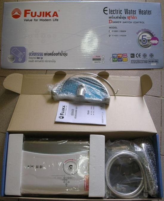 เครื่องทำน้ำอุ่น Fujika 4500 watt (F-4551) รุ่นมีเกลือสปา สีขาว-เทา ฮีทเตอร์เป็นแบบท่อ ไม่ใช่แบบ หม้อต้ม ระบบตัดไฟฟ้ารั่วเป็นแบบ ELSD ตัดรั่วที่ 10 mA ในเวลา 0.1 วินาที ขายเนื่องจากแฟนไม่ชอบสีและหน้าตา ก็เลยไม่ได้ใช้ ยังไม่ได้ติดตั้งและใช้งาน มี 2 เครื่อง (ซื้อมาเครี่องละ 6,790 บาท) ขายเครืองละ 4,500 บาท ไม่รวมค่าจัดส่ง
