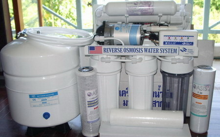ขั้นที่ 4 Revers Osmosis Membrane 50GPD เป็นการกรองระบบ RO โดยใช้ปั้มสร้างแรงดัน อัดผ่านเยื่อเมนเบร(Membranes) ที่มี รูพรุนละเอียดมาถึง 0.0001 ไมครอน ซึ่งมั่นใจ น้ำที่ได้จะสะอาด สามารถบริโภคได้อย่างปลอดภัย