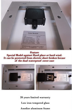 Maximum power (Wp) 5W Maximum power voltage (V) 18 Maximum power current (A) 0.28Open circuit voltage (V) 21.6 Short circuit current (A) 0.31 Size of module (mm) 400×300×35 Maximum system voltage (V) 1000 Temperature coefficients of Isc (%) +0.1/°C Temperature coefficients of Voc (%) -0.38/°C Temperature coefficients of Pm (%) -0.47/°C Temperature coefficients of Im (%) +0.1/°C Temperature coefficients of Vm (%) -0.38/°C Temperature Range -40°C ---80°C Tolerance Wattage (e.g. +/-5%) ±5% Surface Maximum Load Capacity 60m/s (200kg/sq.m) Weight per piece (kg) 1.2 Junction Box Type PPO, black Connectors and Cables Type 4mm2 Length of Cables (mm) 300 Cell Efficiency (%) >15 Module Efficiency (%) >12.35 Output tolerance (%) ±5% Frame (Material, Corners, etc.) Anodized Aluminum Alloy Standard Test Conditions AM1.5 100MW/c(C) 25° Warranty 24 months Guarantee of power 90% within 10 years,80% within 20 years FF (%) ≥73.3%