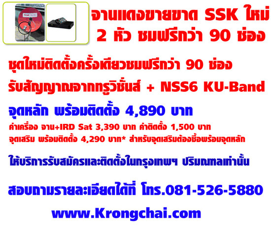 จานแดงขายขาด รุ่นใหม่ 2 หัวรับชม NSS6 ได้ด้วยครับ ราคาพร้อมติดตั้ง 4,890 บาท ชมช่องรายการกว่า 90 ช่อง ติดตั้งได้ทุกวัน ที่นี่ที่เดียว www.krongchai.com Tel.081-526-5880