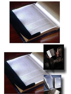 ไฟอ่านหนังสือ จะเป็นแผ่นซึ่งสามารถเปิดไฟและวางลงบนหนังสือที่เราจะอ่าน มีน้ำหนักเบาพกพาสะดวก ประมาณ 100 กรัม ขนาด 14.8x17.6x1.5 cm ใช้ถ่านAAA 3 ก้อน ใช้งานประมาณ 40-50 ชม.จึงเปลี่ยนถ่าน