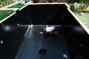 9. จากนั้นก็ปูวัสดุรองสระ (Liner) ลงบนชั้นทรายที่โรยไว้ได้เลย คลี่ออกแล้วตากแดดสัก 30 นาทีก่อน การปูจะง่ายขึ้นถ้าคุณมีผู้ช่วย กางวัสดุรองสระ (Liner) ไว้เหนือสระ พยายามกางให้คลุมถึงขอบสระด้วย จากนั้นก็ค่อย ๆ วางลงไปในสระ