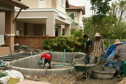 6. ขั้นต่อไปคือการปรับระดับรอบสระให้เรียบเท่ากัน ถ้ามีจุดไหนที่สูง-ต่ำกว่ากันให้ถมดินเข้าไป