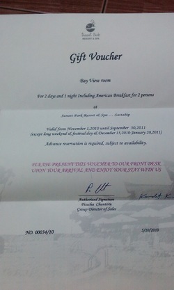 พอดีได้ Voucher มาจากบริษัทครับ แต่คิดว่าคงไม่ได้ไปแน่ๆครับ เป็นห้อง Bay View ครับ 2วัน1คืน รวมอาหารเช้าสำหรับ 2 ท่านครับ ราคาเต็มอยู่ที่ 7,003 บาท ขอขายที่ 4,000 ใช้ได้ถึงวันที่ 30 กย. 2554 ครับ