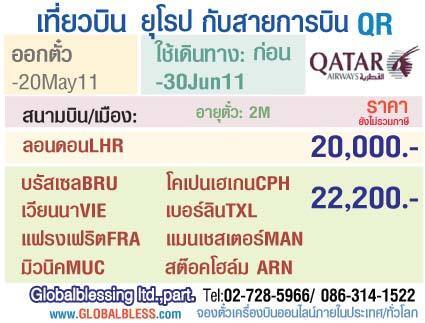 โปรโมชั่นตั๋วเครื่องบินสายการบิน QATAR AIRWAYS เส้นทาง ยุโรป ลอนดอน บรัสเซล เวียนนา แฟรงเฟริต มิวนิค โคเปนเฮเกน เบอร์ลิน แมนเซสเตอร์ สต๊อกโฮม สนใจติดต่อได้ที่ หจก.โกลเิบิลเบลสซิ่ง 02-7285966 / 086-3141522