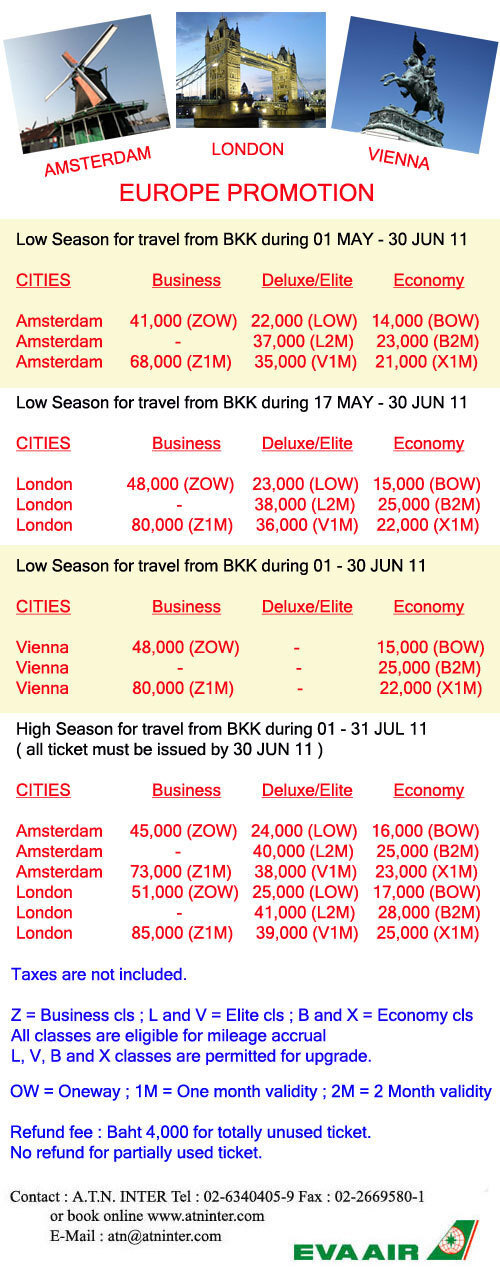 EVA AIR'S AMSTERDAM LONDON VIENNA PROMOTION ออกเดินทางจากรุงเทพระหว่าง 1 พฤษภาคม - 31 กรกฎาคม 2011