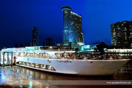 19.30 น. ออกจากท่าเรือริเวอร์ซิตี้ เชิญทุกท่านรับประทานอาหารค่ำแบบบุฟเฟ่ต์ไทย–ยุโรปอาหารญี่ปุ่น พร้อมทั้งผลไม้,ของหวาน, ชา-กาแฟ ท่ามกลางความงดงามของลำน้ำเจ้าพระยายามค่ำคืน ชื่นชมสถาปัตยกรรมไทยอันล้ำค่าที่เรียงรายตลอดสองริมฝั่ง ได้แก่ วัดกัลยา, พระปรางค์วัดอรุณ ฯ,พระบรมมหาราชวัง, วัดพระแก้ว และสะพานที่สำคัญ เช่น สะพานพุทธฯ, สะพานพระราม 8 พร้อมชมการแสดงรำไทย (โขน) สนุกสนานกับดนตรีและนักร้องคุณภาพที่ให้ความบันเทิงทุกช่วงเวลาที่ท่านเดิน ทางกับ แกรนด์ เพิร์ล
