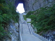 บ่าย นำท่านเดินทางสู่ ภูเขาเทียนเหมินซาน ตั้งอยู่มณฑลหูหนาน สมัยก่อนเรียกว่า ภูเขาหวินเมิ้งซาน หรือ ซงเหลียวซาน เป็นประวัติแรกของจางเจียเจี้ย นั่งกระเช้า ขึ้นสู่ เขาเทียนเหมินซาน ซึ่งมีความยาวถึง 7.5 กิโลเมตร ใช้เวลา 40 นาที ถึงเขาเทียนเหมินซานเป็นกระเช้าที่ทันสมัยที่สุด ชมความมหัศจรรย์หน้าผาลอยฟ้า สัมผัสความแปลกใหม่ของการท่องเที่ยว ชมต้นไม้ออกมาจากซอกหิน หลากหลายพันธุ์ ดอกไม้ป่าตามฤดูกาล ท่านจะได้ชมความงามของภูเขา ภูผา นับร้อยรูป ยอดเขาสูงเสียดฟ้า งามแปลกตา อิสระให้ท่านเพลิดเพลินและสัมผัสความงามของยอดเขา จากนั้นนำท่านโดยสารกระเช้าลงที่สถานีกลางเพื่อเปลี่ยนรถท้องถิ่นผ่านเส้นทางที่มีความโค้ง 99 โค้งสู่ ถ้ำเทียนเหมินต้ง หรือเรียกว่า ถ้ำประตูสวรรค์เทียนเหมินซาน เป็น 1 ใน 4 ของภูเขาที่สวย สาเหตุที่เรียกว่าเทียนเหมินซานเพราะว่า ภูเขาเกิดระเบิดขึ้นเองโดยธรรมชาติจนกลายเป็นถ้ำ ประตูนี้มีความสูง 131.5 เมตร ความกว้าง 57 เมตร ความลึก 60 เมตร เมื่อท่านมาถึงถ้ำประตูสวรรค์ท่านจะได้ขึ้นขั้นบันได 999 ขั้น สู่ ภูเขาประตูสวรรค์ ถ่ายรูปชมความงามซึ่งเคยมีชาวรัสเซียได้ขับเครื่องบินเล็กลอดผ่านช่องภูเขาประตูสวรรค์มาแล้วเป็นสถานที่ที่น่าสนใจจากชาวต่างชาติอีกแห่งหนึ่ง สมควรแก่เวลาเดินทางลงจากยอดเขาเทียนเหมินซาน จากนั้นนำท่านชม จิตรกรรมภาพวาดทราย หรือ จวินเซิงฮวาเยี้ยน สถานที่ซึ่งจัดแสดงภาพวาดของ หลี่จวินเซิง ซึ่งเป็นผู้ที่ริเริ่มศิลปะแบบใหม่ ที่เรียกกันว่า จิตรกรรม ภาพเม็ดทราย ที่ใช้วัสดุธรรมชาติ เช่น กรวดสี เม็ดทราย กิ่งไม้ หิน ฯลฯ มาจัดแต่งเป็นภาพทิวทัศน์ จิตรกรรมที่รังสรรค์ขึ้นมา ล้วนได้รับรางวัลและการยกย่องมากมายหลายปีซ้อน จนเป็นที่เลื่องลือไปทั่วโลก