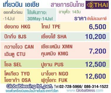 โปรโมชั่นตั๋วเครื่องบินสายการบินไทย (TG) เส้นทาง ฮ่องกง, ไทเป, ปักกิ่ง, เซียงไฮ้, กวางโจว, เซียะเหมิน, เฉินตู, คุนหมิง, โซล, ปูซาน, โตเกียว, นาโงยา, โอซาก้า, ฟุกุโอกะ ติดต่อ หจก.โกลเบิลเบลสซิ่ง 02-7285966 / 086-3141522