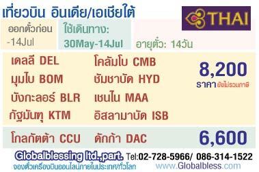 โปรโมชั่นการบินไทย เส้นทางอินเดีย เดลลี, โคลัมโบ, มุมไบ, ซัมซาบัด, บังกะลอร์, เชนไน, กัฐมันฑุ, อิสลามาบัด, โกลกัตต้า, ดักก้า สนใจติดต่อ หจก.โกลเบลเบลสซิ่ง 02-7285966 / 086-3141522