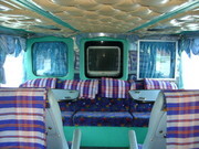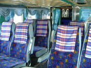 ตัวรถสีสันสดใส เบาะนั่งหนานุ่มนั่งสบาย มีที่พักมือและที่พักเท้า ชั้นบน 41 ที่นั่ง และชั้นล่างโซฟา