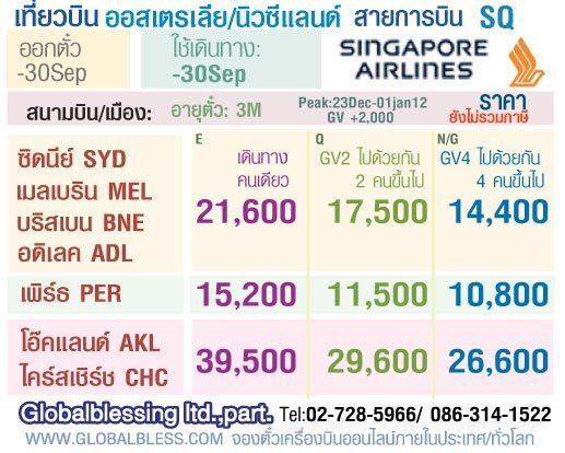 โปรโมชั่นตั๋วเครื่องบินสายการบินสิงค์โปร์ เส้นทางซิดนี่ย์, เมลเิบริน, บริสเบน, อดิเลค, เพิร์ธ, โอ๊ดแลนด์, ไคร์สเชิร์ช ติดต่อได้ที่ หจก.โกลเบิลเบลสซิ่ง 02-7285966 / 086-3141522