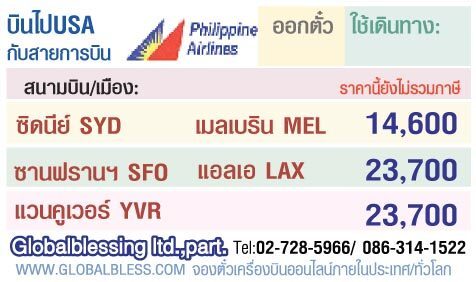 โปรโมชั่นตั๋วเครื่องบิน สายการบินฟิลิปปินส์ เส้นทาง กรุงเทพฯ - ซานฟราน ซีเอ็ตเติ้ล ลอสแอลเจอลีส แวนคูเวอร์ สนใจติดต่อได้ที่ หจก.โกลเบิลเบลสซิ่ง 02-7285966 / 086-3141522