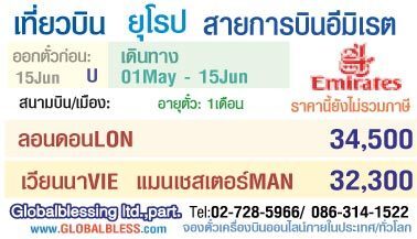 โปรโมชั่นตั๋วเครื่องบินสายการบินอิมิเรต (EMIRATES) เส้นทางยุโรป ลอนดอน เวียนนา แมนเชสเตอร์ สนใจสำรองที่นั่งได้ที่ หจก.โกลเบิลเบลสซิ่ง 02-7285966 / 086-3141522