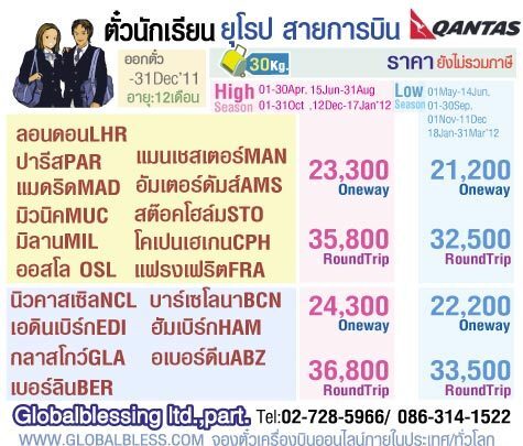 ตั๋วเครื่องบินราคานักเรียน เยาวชน บินด้วยสายการบิน QANTAS & BRITISH AIRWAYS เส้นทางยุโรป ลอนดอน ปารีส มิวนิค มิลาน แฟรงเฟริต กลาสโกว์ ฯลฯ สนใจติดต่อ หจก.โกลเบิลเบลสซิ่ง 02-7285966 / 086-3141522
