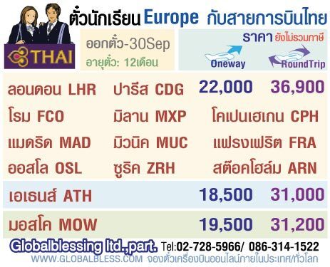 ตั๋วเครื่องบินสำหรับนักเรียน ไปยุโรปกับการบินไทย สนใจติดต่อได้ที่ หจก.โกลเบิลเบลสซิ่ง 02-7285966 / 086-3141522