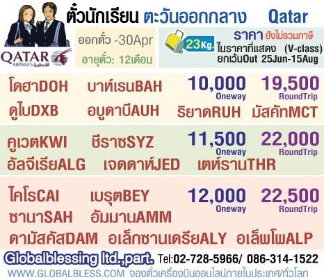 ตั๋วเครื่องบินราคานักเรียน เยาวชน สายการบิน QATAR AIRWAYS เส้นทางตะวันออกกลาง, โดฮา, ดูไบ, คูเวต ฯลฯ สนใจติดต่อ หจก.โกลเบิลเบลสซิ่ง 02-7285966 / 086-3141522
