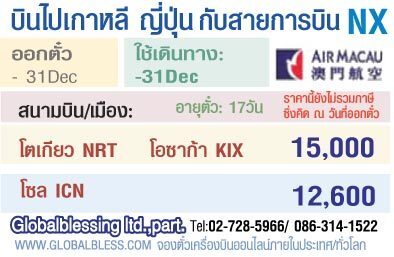 โปรโมชั่่นตั๋วเครื่องบิน สายการบินแอร์มาเก๊า เส้นทางกรุงเทพฯ - โตเกียว โอซาก้า โซล สนใจติดต่อได้ที่ หจก.โกลเบิลเบลสซิ่ง 02-7285966 / 086-3141522