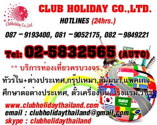 คลับฮอลิเดย์ ยินดีต้อนรับทุกท่านสู่โลกแห่งการท่องเที่ยวครบวงจร ตั๋วเครื่องบิน ตั๋วนักเรียน ทัวร์ต่างประเทศและในประเทศ แพ็คเกจทัวร์ รับทำวีซ่า ทัวร์หมู่คณะ กรุ๊ปเหมาสัมมนา การศึกษาต่อต่างประเทศ รวมถึงการจองโรงแรมทั่วโลก ในราคาสุดพิเศษและพร้อมให้คำปรึกษาในการเดินทางของทุกๆท่านเลยค่ะ.....คลิ๊กเลยhttp://www.clubholidaythailand.com หรือ Tel.02-5832565 (Auto) Fax.02-9646958