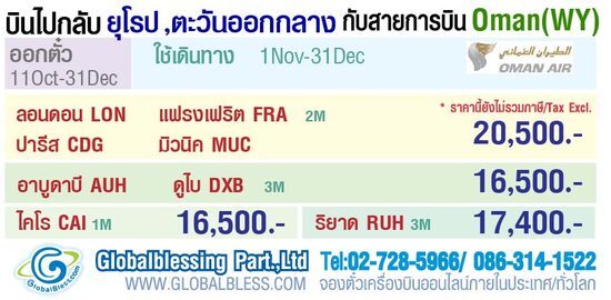 โปรโมชั่นตั๋วเครื่องบินสายการบิน OMAN AIR เส้นทางลอนดอน ปารีส แฟรงเฟริต มิวนิค ไคโร อาบูดาบี ดูไบ ติดต่อได้ที่ หจก.โกลเบิลเบลสซิ่ง 02-7285966 / 086-3141522