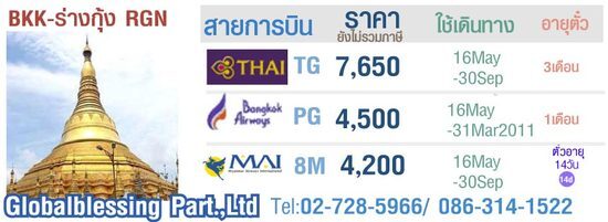 ตั๋วเครื่องบินเส้นทางกรุงเทพฯ - ย่างกุ้ง มีหลายสายการบินให้ท่านได้เลือกเดินทาง ติดต่อที่ หจก.โกลเบิลเบลสซิ่ง 02-7285966 / 086-3141522
