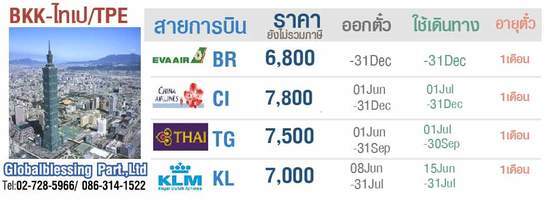 ตั๋วเครื่องบินไป-กลับกรุงเทพฯ - ไทเป มีหลายสายการบินให้ท่านได้เลือกเดินทางติดต่อ หจก.โกลเบิลเบลสซิ่ง 02-7285966 / 086-3141522