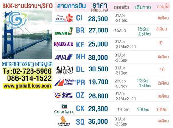ตั๋วเครื่องบินเส้นทางกรุงเทพฯ - ซานฟราน มีหลากหลายสายการบินให้ท่านได้เลือกเดินทางกันคะ สนใจติดต่อ หจก.โกลเบิลเบลสซิ่ง 02-7285966 / 086-3141522