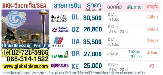 ตั๋วเครื่องบินเส้นทางกรุงเทพฯ - ซีแอตเทิล มีหลายสายการบินให้ท่านเลือกเดินทาง สนใจติดต่อ หจก.โกลเบิลเบลสซิ่ง 02-7285966 / 086-3141522