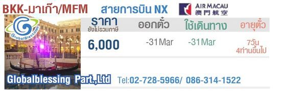 ตั๋วเครื่องบินเส้นทางกรุงเทพฯ - มาเก๊า สายการบินแอร์มาเก๊า สนใจติดต่อได้ที่ หจก.โกลเบิลเบลสซิ่ง 02-7285966 / 086-3141522