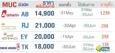 ตั๋วเครื่องบินเส้นทางกรุงเทพฯ - มิวนิค มีหลายสายการบินให้ท่านเลือกเดินทาง ติดต่อได้ที่ หจก.โกลเบิลเบลสซิ่ง 02-7285966 / 086-3141522