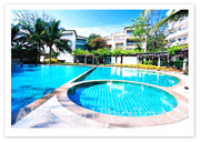 เดี่ยว อีกห้องเป็นเตียง Double) มีห้องน้ำอยู่ตรงกลางระหว่าง 2 ห้อง ทางเดินตรงกลางระหว่างอพาร์ทเม้นท์ทั้ง 2 ฝั่งเป็นสวนร่มรื่นตลอดทางไปยังสระว่ายน้ำ