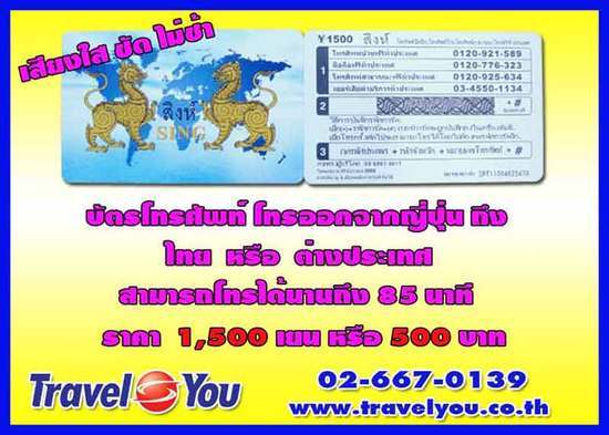 ขายบัตรโทรศัทพ์ โทรกลับประเทศไทย จากประเทศญี่ปุ่น ชัดเจน ไม่ติดขัด ราคา 1,500 เยน มีปัญหารับคืนค่ะ ประกันคุณภาพ ติดต่อ+*+*+ทราเวิล ยู +*+*+ http://www.travelyou.co.th tel.026670139