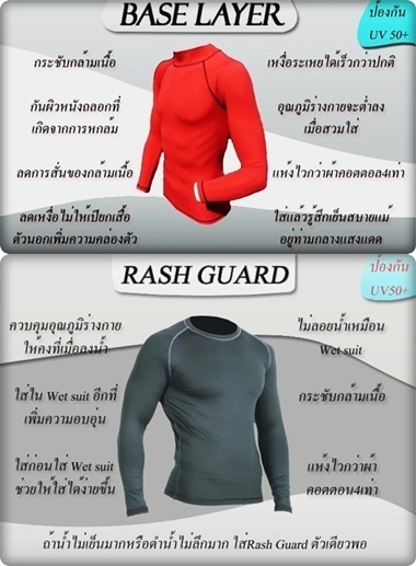 -ถ้าน้ำไม่เย็นมาก หรือ ไม่ดำลึกมาก ใส่แต่ Rash guard อย่างเดียวก็ได้ (กีฬาทางน้ำ)