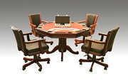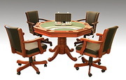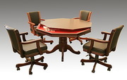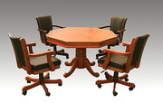 This stylish Flip-Top Dining/Poker Table Set in Hard Wood features a reversible top that provides a game-playing surface opposite a smooth solid surface. Add 4, 6, or 8 optional matching Chairs with Black Leather seat to create a truly exceptional setting for your home.