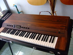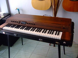Here is a nice old keyboard that can bridge the gap of an electric piano and an electric harpsichord. It has a very deep tremolo and nice voicings you can toggle between. It also has a handsome fake wood exterior. The fake wood look was a real desired thing in the 60's and 70's, it seems. Many of my cheaper fun instruments are made of plastic with the fake wood look. It was also the time of those large station wagons with fake wood siding and that cheap fake wood paneling in basements and wreck rooms. My friend Barry once planned to start a band with only instruments with fake wood exteriors. We also joked about having a band called 'the Leslies' in which all instruments were to be played through spinning Leslie speakers. We would play 'Crimson and Clover' and 'Hurdy Gurdy Man' and songs like that. Also, an all Stylophone band called 'Stylophone Council'... And an all drum machine band called 'Drum Machine Circle'. Oh, we have had many many great ideas...