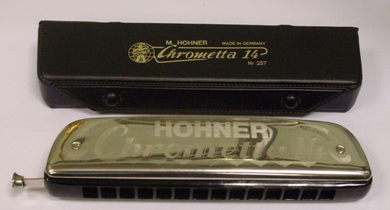 ขาย Harmonica แบบ chromatic ยี่ห้อ Hohner รุ่น Chrometta 14 ผลิตในประเทศเยอรมัน ตัวเครื่องสีโครเมี่ยม เนื้องานและคุณภาพเสียงดีมาก