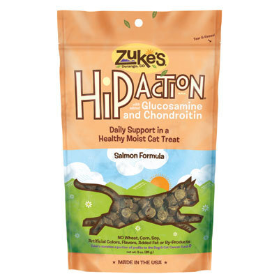 Zukes Hip Action Cat Treats with Glucosamine and Chondroitin contain essential cofactor vitamins and minerals that aid in absorption. Each cat treat contains 50mgs of glucosamine and 35mgs of chondroitin. They are easy to feed your cat and are wheat, corn and soy free. Zukes treats are made in the USA. 3 oz