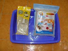 กระบะทรายสี่เหลี่ยมผืนผ้า (ในรูปสีฟ้า)พร้อมที่ตัก และทรายแมว ชามกลม 2 ใบ