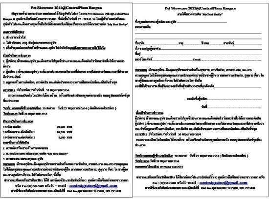 เชิญชวนเข้าร่วมการประกวดแต่งกายให้กับสุนัขตัวโปรด ในงาน Pet Showcase 2011@CentralPlaza Bangna ณ ศูนย์การค้าเซ็นทรัลพลาซา บางนา ซึ่งจัดขึ้นในวันที่ 27 - 31พ.ค. 54 โดยผู้เข้าร่วมแข่งขันและสุนัขตัวโปรดจะต้องสวมชุดเสื้อผ้าสัตว์เลี้ยงตามสไตล์ที่คุณชื่นชอบ ภายใต้แนวความคิด “My Best Buddy”