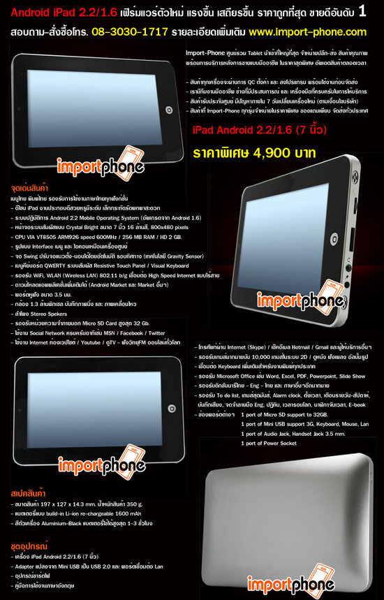 รายละเอียดเพิ่มเติม : http://www.import-phone.com/shop/importphone/iPad_Android_22_Froyo_8_นิ้ว-000232-TH-pdtdetail.html