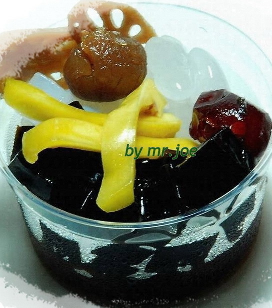 เฉาก๊วยเหนียวหนึบเสริฟพร้อมเครื่องได้แก่ พุทราจีนเชื่อม,วุ้นมะพร้าว,รากบัว,ถั่วแดง,แปะก้วยโรยหน้าด้วยน้ำตาลอ้อย หวานหอมอร่อยชื่นใจ