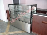 ตู้แช่เย็น โชว์เค้ก ทั้งแบบกระจกโค้ง และ แบบกระจกตรง (ตู้เหลี่ยม) ซึ่ง มีระบบพัดลมเป่าอย่างดีที่กระจก เพื่อช่วยลดปริมาณละอองน้ำที่อาจจะเกาะที่กระจก
