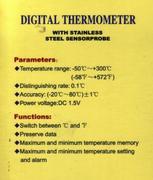 Fashionable appearance, stainless steel sensing tips, lengthened wire, box design, convenient to store, inner bracket, wide measuring range, applied to industry, agricuture and refrigerator etc...
