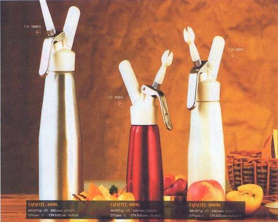 ขวดทำวิปครีม (Cream Whipper) คืออุปกรณ์สำหรับเตรียมวิปครีมและเตรียมอาหาร เช่น มูส ซอส ทั้งร้อนและเย็น ผลิตจากอลูมิเนียมที่มีคุณภาพสูง และมีความหนาไม่น้อยกว่า 4 มม. (Restaurant Quality) ฝาทำด้วยอลูมิเนียมอัลลอยด์ และพลาสติกอย่างหนา ทนแรงดันสูง สวยงาม ทนทาน ล้างทำความสะอาดง่าย เหมาะสำหรับ ร้านอาหาร ร้านกาแฟ ร้านไอศครีม และอื่นๆ