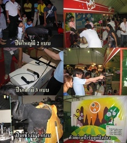 ชนิิดของปืนมีดังนี้ ปืนใหญ่แบบโบราณมีล้อเข็นได้.. ปืนยาวแบบยิงรถถังพาดบ่ายิง..ปืนสั้นน้ำหนักเบายิงสบายมือ.. ปืนรูปช้างสำหรับเด็กเล็กขี่ยิง ตั้งพื้นหรือบนโต๊ะ สามารถนั่งบนตัวช้างได้ ยิงลูกปิงปองจากงวงช้าง..