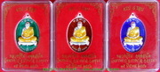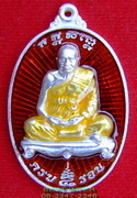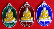 ด้านหน้าเป็นรูปหลวงปู่นั่งเต็มองค์บนโต๊ะขาสิงห์ ลงยาสีพื้น สีน้ำเงิน,สีแดง, สีเขียว