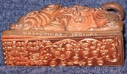 ใต้ฐานบรรจุตะกรุดมหาทรหด ปิดทับด้วยแผ่นยันต์ปั๊มหมูโทนทองแดง ส่วนที่หางคล้องเหรียญโค๊ตยันต์ เป็นรูปเขี้ยวหมูป่า บริเวณฐานด้านข้าง กำกับด้วยยันต์ และเลขหมายด้วยการยิงเลเซอร์