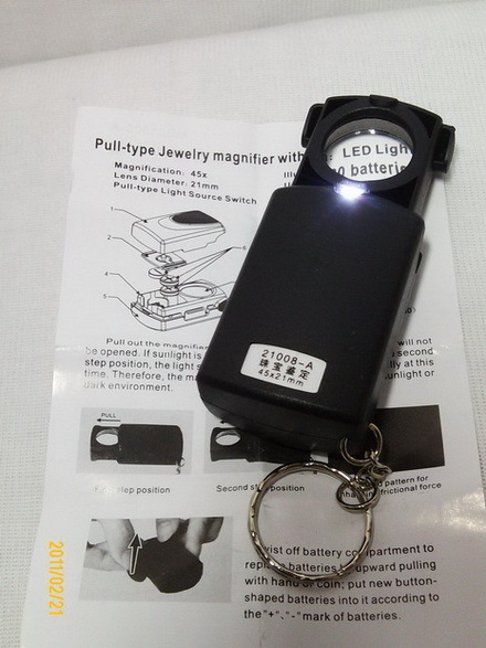 เป็นกล้องส่องแบบชักเก็บได้ กำลังขยาย 45x21mm ใช้สำหรับส่องเนื้อพระเครื่องได้ชัดเจนและจิวเวอรี่ มีไฟแสงขาวช่วยส่อง พกพาสะดวก ใช้ถ่านLR 1130 จำนวน 3 ก้อน