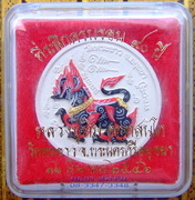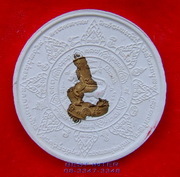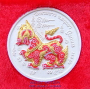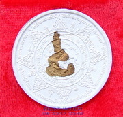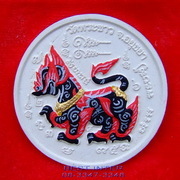 ด้านหน้าเป็นสิงห์มหาบารมี เพ้นท์สีดำ-สีแดง และปิดทองคำเปลว ลักษณะทรงกลมขนาด 3.3 ซ.ม.